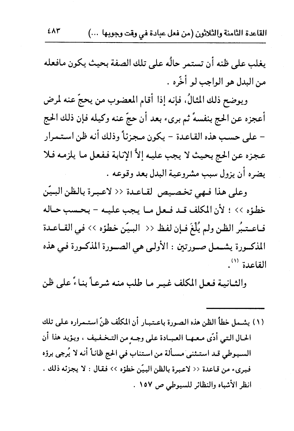 ١ يشمل خطأ الظن هذه الصورة باعتبار أن المكلف ظن استمراره على تلك الحال التي أدّى معها العبادة على وجه من التخفيف، ويؤيد هذا أن السيوطي قد استثنى مسألة من استناب في الحج ظانا أنه لا يُرجى برؤه فبرئ من قاعدة ((لا عبرة بالظن البين خطؤه)) فقال: "لا يجزئه ذلك" انظر: الأشباه والنظائر للسيوطي ص١٥٧.