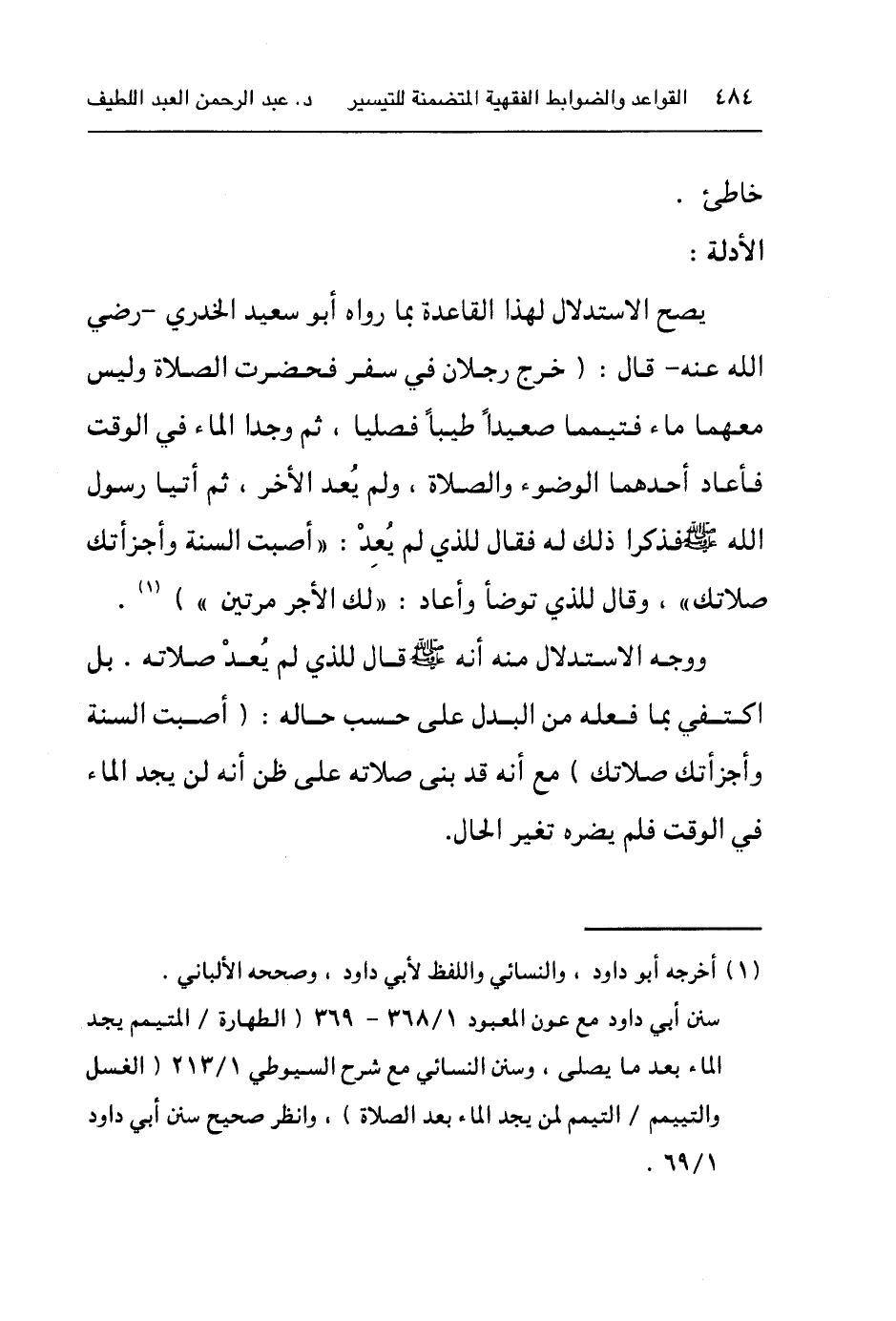 ١- يصح الاستدلال لهذه القاعدة بما رواه أبو سعيد الخدري رضي الله عنه قال: "خرج رجلان في سفر فحضرت الصلاة وليس معهما ماء فتيمما صعيدا طيبا فصليا، ثم وجدا الماء في الوقت فأعاد أحدهما الوضوء والصلاة، ولم يُعد الآخر، ثم أتيا رسول الله صلى الله عليه وسلم فذكرا له ذلك فقال للذي لم يعد: "أصبت السنة وأجزأتك صلاتك"، وقال للذي توضأ وأعاد: "لك الأجر مرتين" ١.