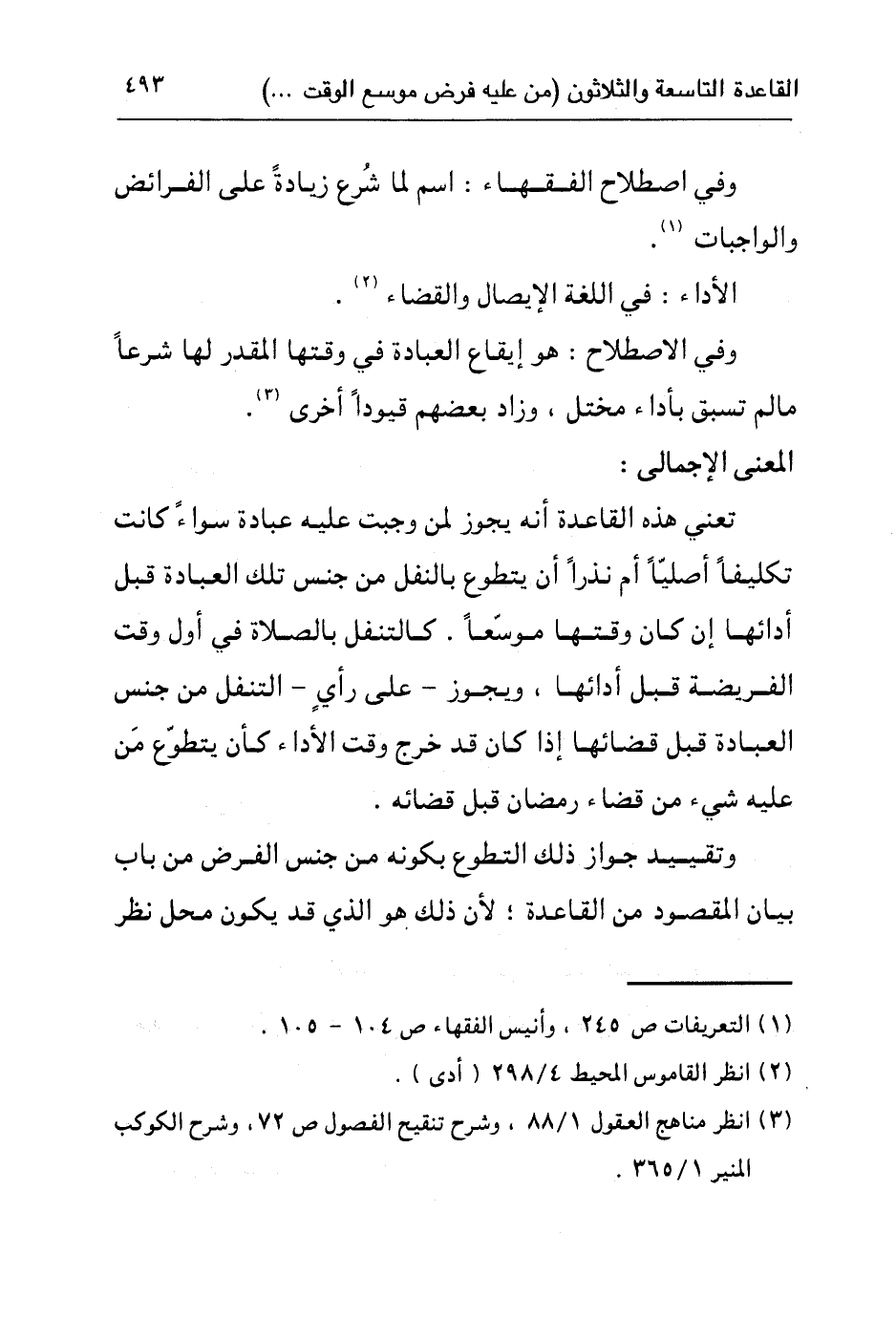 وفي الاصطلاح: هو إيقاع العبادة في وقتها المقدر لها شرعا مالم تسبق بأداء مختل، وزاد بعضهم قيودا أخرى٣.