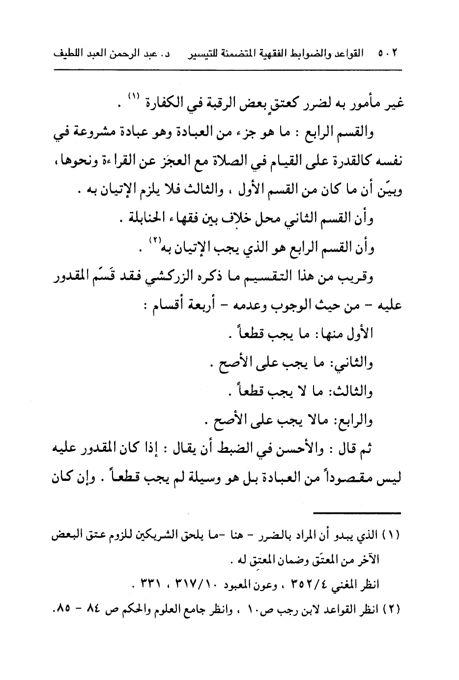 والقسم الرابع: ما هو جزء من العبادة وهو عبادة مشروعة في نفسه كالقدرة على القيام في الصلاة مع العجز عن القراءة ونحوها، وبيّن أن ما كان من القسم الأول، والثالث فلا يلزم الإتيان به.