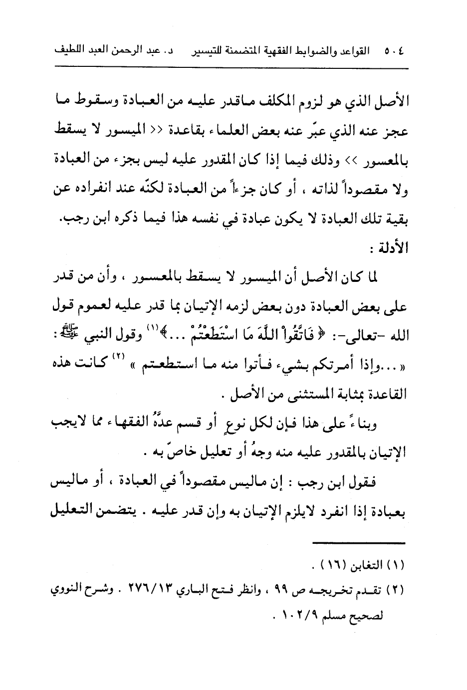 الأصل الذي هو لزوم المكلف ما قدر عليه من العبادة وسقوط ما عجز عنه الذي عبّر عنه بعض العلماء بقاعدة ((الميسور لا يسقط بالمعسور)) وذلك فيما إذا كان المقدور عليه ليس بجزء من العبادة ولا مقصودا لذاته، أو كان جزءا من العبادة لكنه عند انفراده عن بقية تلك العبادة لا يكون عبادة في نفسه هذا فيما ذكره ابن رجب.