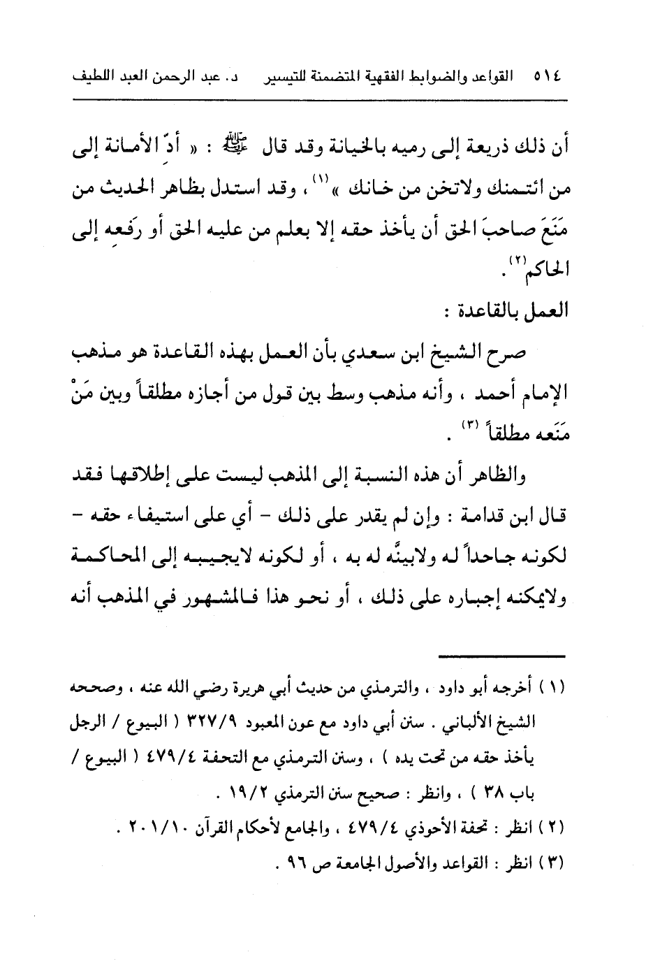 ١ أخرجه أبو داود، والترمذي من حديث أبي هريرة رضي الله عنه، وصححه الشيخ الألباني. سنن أبي داود مع عون المعبود ٩/٣٢٧ (البيوع / الرجل يأخذ حقه من تحت يده) ، وسنن الترمذي مع التحفة ٤/٤٧٩ (البيوع / باب ٣٨) ، وانظر: صحيح سنن الترمذي ٢/١٩.