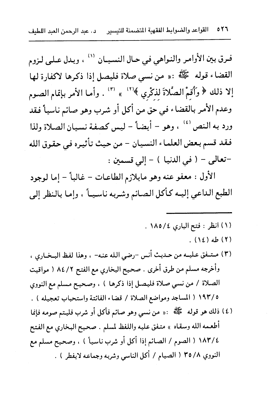 فرق بين الأوامر والنواهي في حال النسيان١، ويدل على لزوم القضاء قوله صلى الله عليه وسلم: "من نسي صلاة فليصل إذا ذكرها لا كفارة لها إلا ذلك {وَأَقِمِ الصَّلاةَ لِذِكْرِي} ٢"٣. وأما الأمر بإتمام الصوم وعدم الأمر بالقضاء في حق من أكل أو شرب وهو صائم ناسيا فقد ورد به النص٤، وهو أيضا ليس كصفة نسيان الصلاة ولذا فقد قسم بعض العلماء النسيان من حيث تأثيره في حقوق الله تعالى (في الدنيا) إلى قسمين: