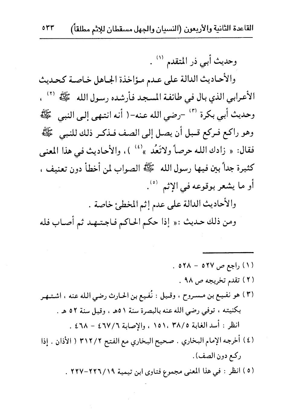 والأحاديث الدالة على عدم مؤاخذة الجاهل خاصة كحديث الأعرابي الذي بال في طائفة المسجد فأرشده رسول الله صلى الله عليه وسلم، وحديث أبي بكرة١ رضي الله عنه أنه انتهى إلى النبي صلى الله عليه وسلم وهو راكع فركع قبل أن يصل إلى الصف فذكر ذلك للنبي صلى الله عليه وسلم فقال: "زادك الله حرصا ولا تَعَد" ٢، والأحاديث في هذا المعنى كثيرة جدا بين فيها رسول الله صلى الله عليه وسلم الصواب لمن أخطأ دون تعنيف، أو ما يشعر بوقوعه في الإثم٣.