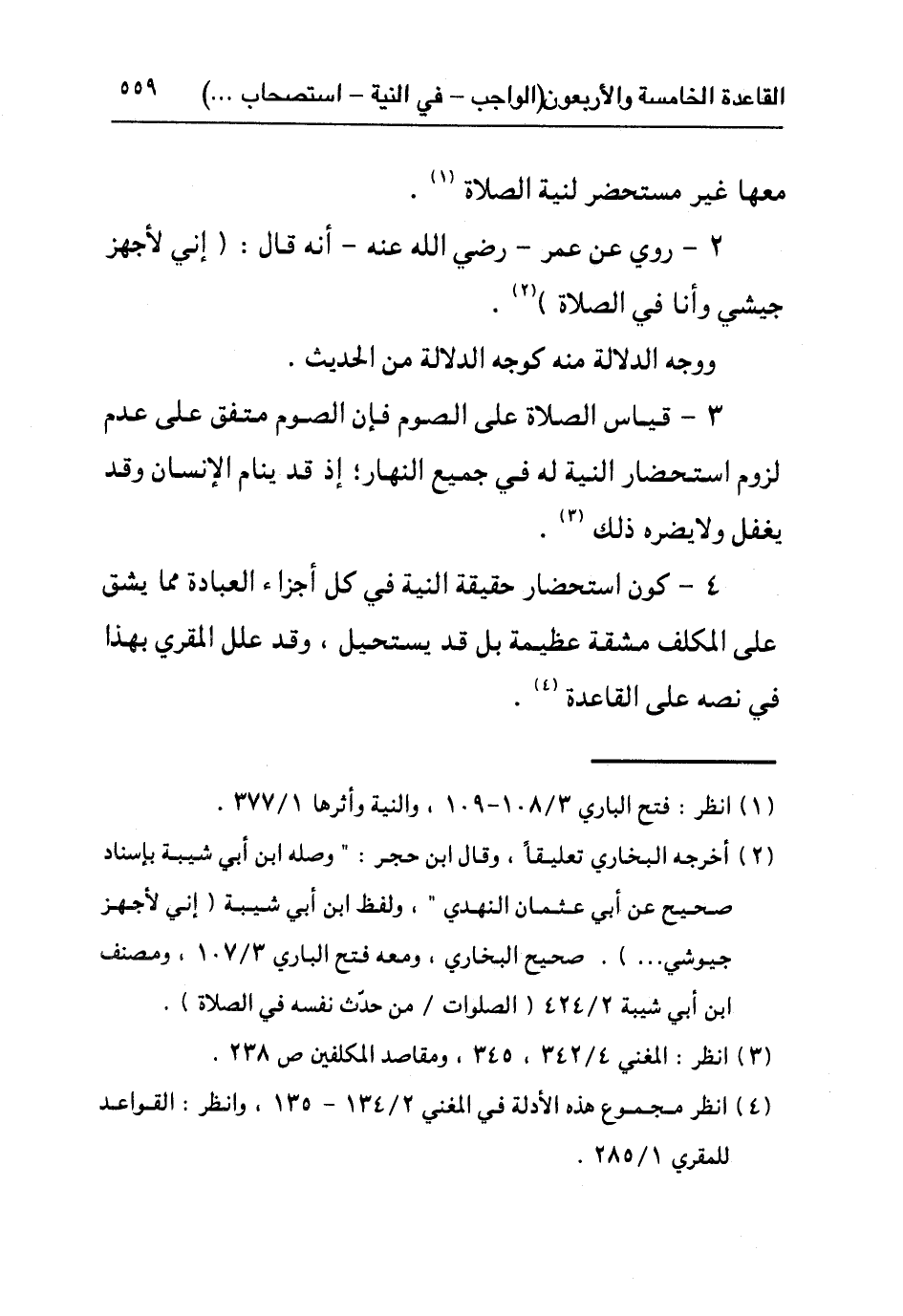 ٤- كون استحضار حقيقة النية في كل أجزاء العبادة مما يشق على المكلف مشقة عظيمة بل قد يستحيل، وقد علل المقري بهذا في نصه على القاعدة٤.
