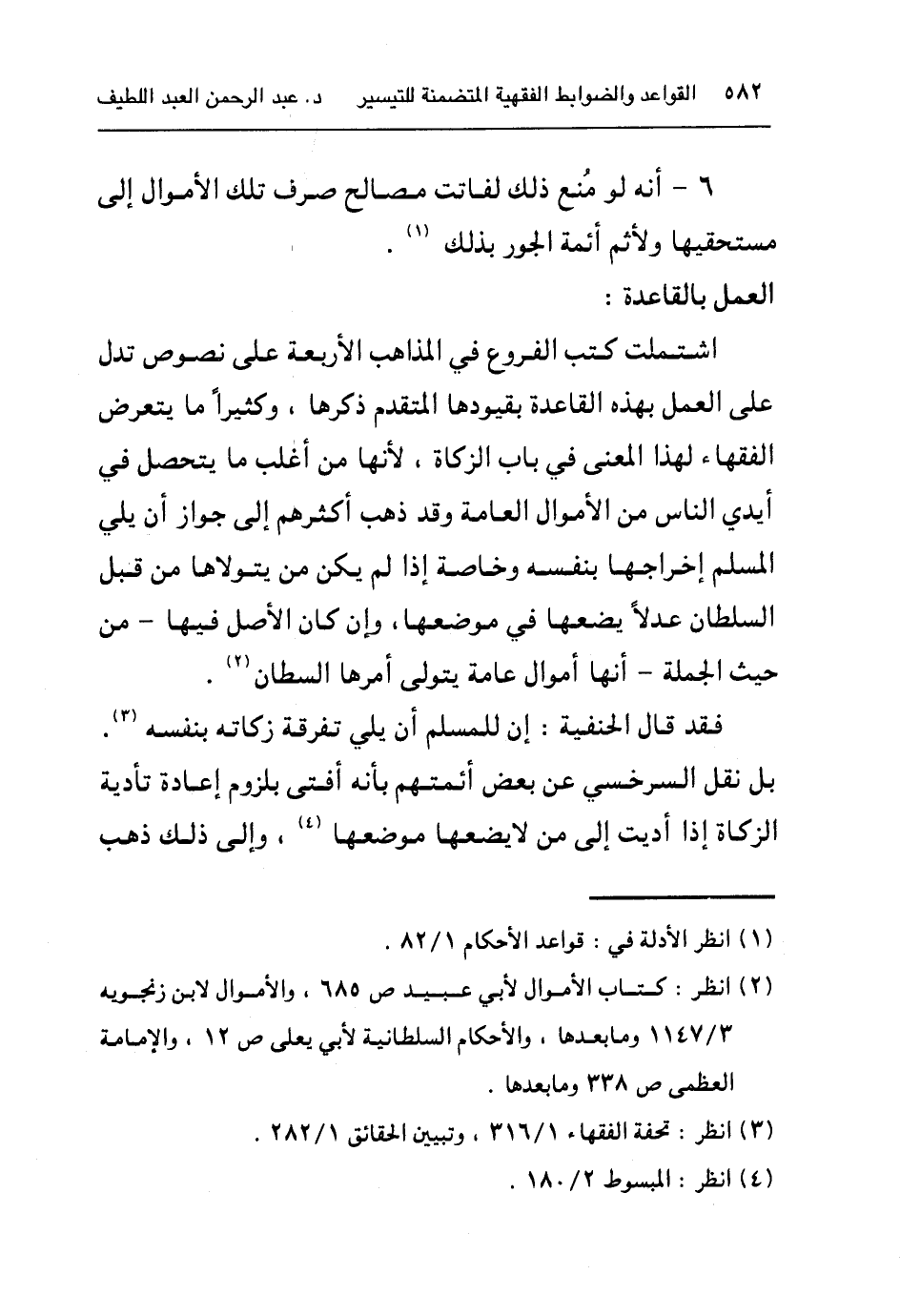 اشتملت كتب الفروع في المذاهب الأربعة على نصوص تدل على العمل بهذه القاعدة بقيودها المتقدم ذكرها، وكثيرا ما يتعرض الفقهاء لهذا المعنى في باب الزكاة، لأنها من أغلب ما يتحصل في أيدي الناس من الأموال العامة وقد ذهب أكثرهم إلى جواز أن يلي المسلم إخراجها بنفسه وخاصة إذا لم يكن من يتولاها من قبل السلطان عدلا يضعها في موضعها، وإن كان الأصل فيها من حيث الجملة أنها أموال عامة يتولى أمرها السلطان٢.