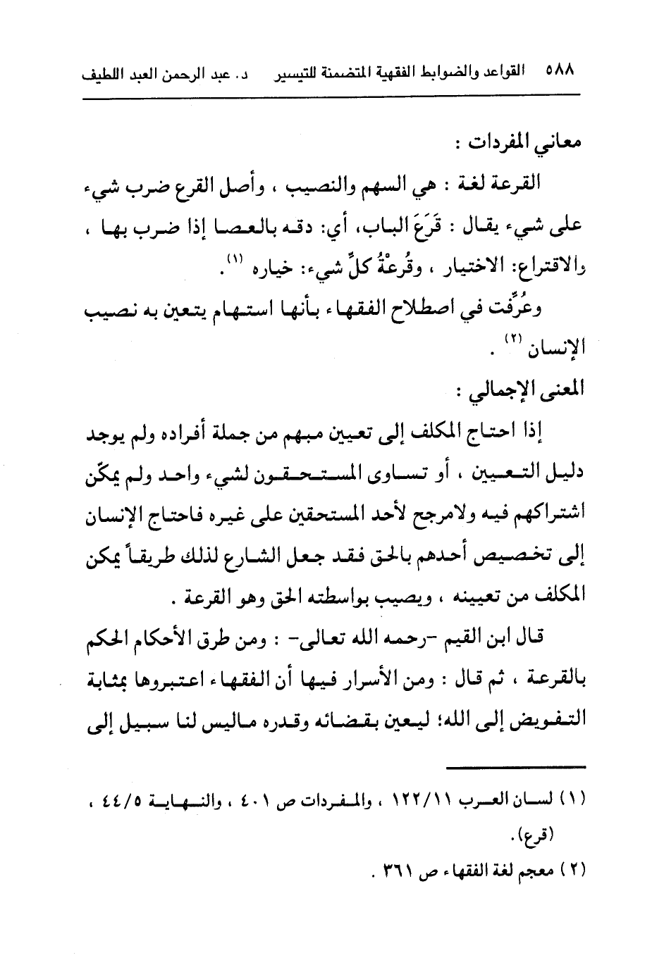 وعُرفت في اصطلاح الفقهاء بأنها استهام يتعين به نصيب الإنسان٢.
