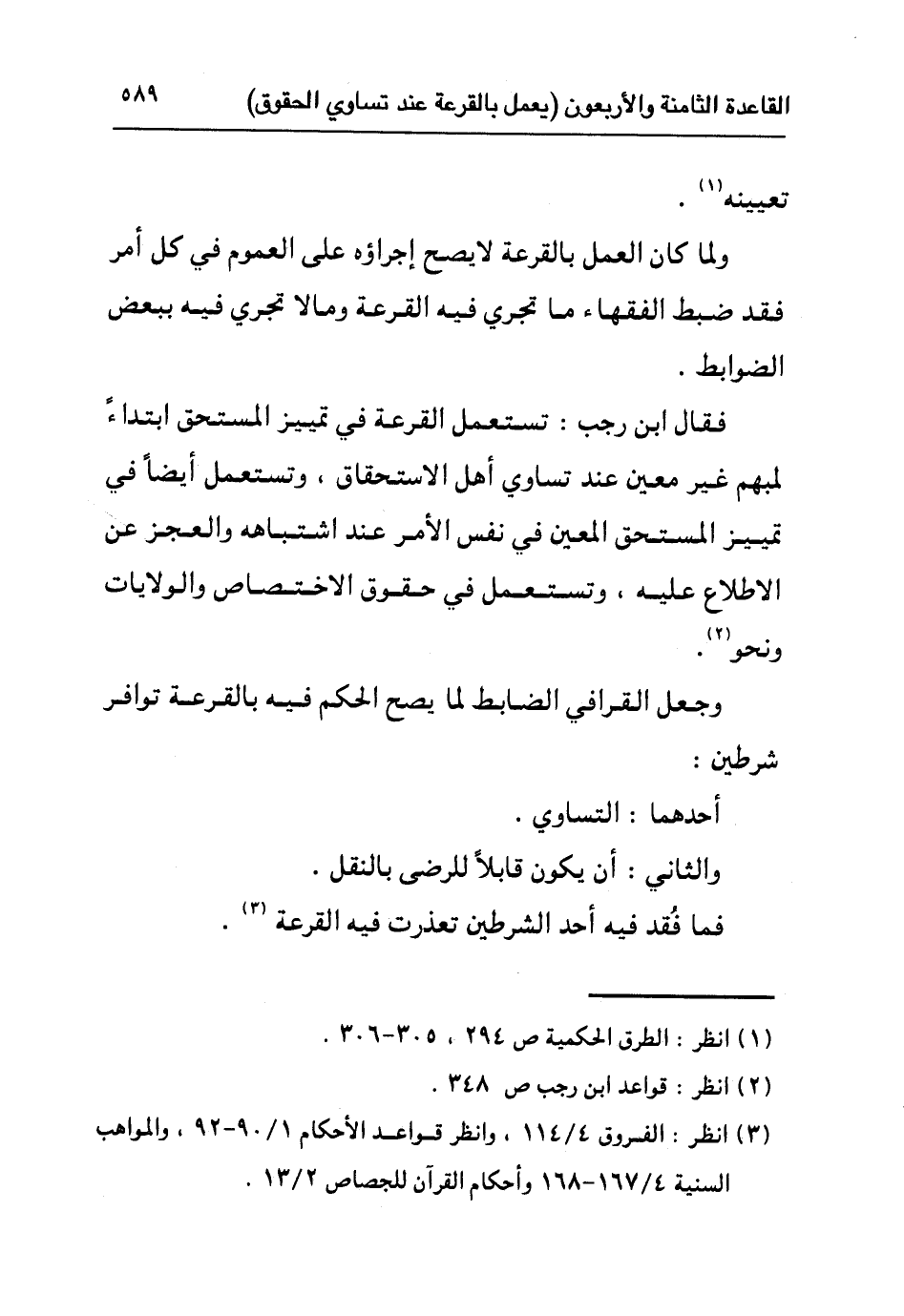 وجعل القرافي الضابط لما يصح الحكم فيه بالقرعة توافر شرطين: