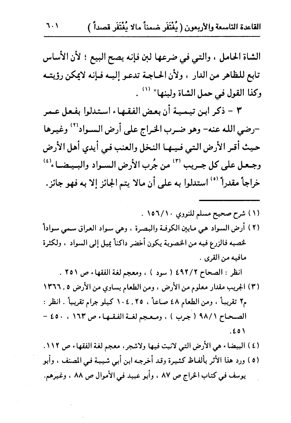٣- ذكر ابن تيمية أن بعض الفقهاء استدلوا بفعل عمر رضي الله عنه وهو ضرب الخراج على أرض السواد٢ وغيرها حيث أقر الأرض التي فيها النخل والعنب في أيدي أهل الأرض وجعل على كل جريب٣ من جُرب الأرض السواد والبيضاء٤ خراجا مقدرا٥ استدلوا به على أن مالا يتم الجائز إلا به فهو جائز.