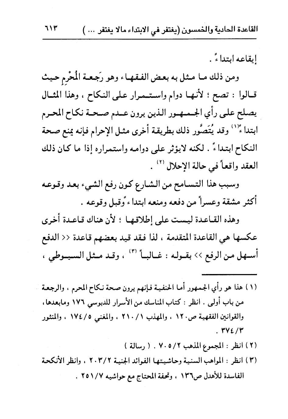 ومن ذلك ما مثل به بعض الفقهاء وهو رَجعة المُحْرِم حيث قالوا: تصح؛ لأنها دوام واستمرار على النكاح، وهذا المثال يصلح على رأي الجمهور الذين يرون عدم صحة نكاح المحرم ابتداء١ وقد يُتَصور ذلك بطريقة أخرى مثل الإحرام فإنه يمنع صحة النكاح ابتداءً. لكنه لا يؤثر على دوامه واستمراره إذا ما كان ذلك العقد واقعا في حالة الإحلال٢.