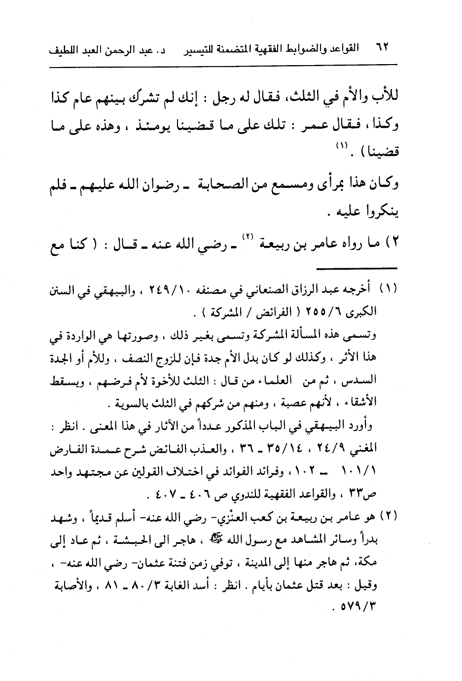 ٢ هو عامر بن ربيعة بن كعب العنزي - رضي الله عنه - أسلم قديما، وشهد بدرا وسائر المشاهد مع رسول الله صلى الله عليه وسلم، هاجر إلى الحبشة، ثم عاد إلى مكة، ثم هاجر منها إلى المدينة، توفي زمن فتنة عثمان - رضي الله عنه - وقيل: بعد قتل عثمان بأيام، انظر: أسد الغابة ٣/٨٠-٨١، والإصابة ٣/٥٧٩.