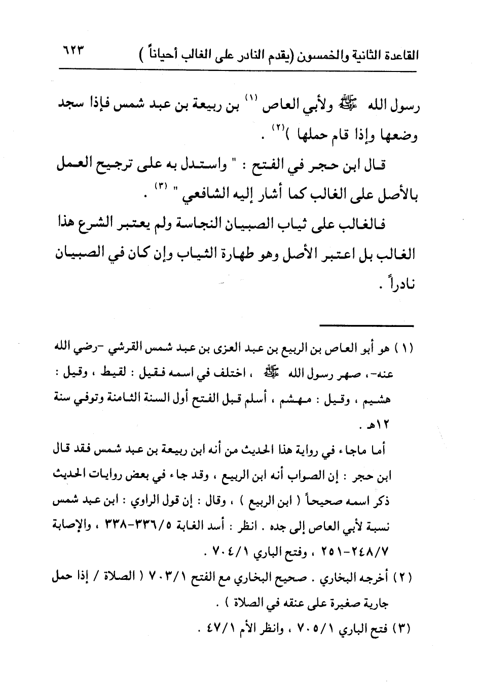قال ابن حجر في الفتح: "واستدل به على ترجيح العمل بالأصل على الغالب كما أشار إليه الشافعي"٣