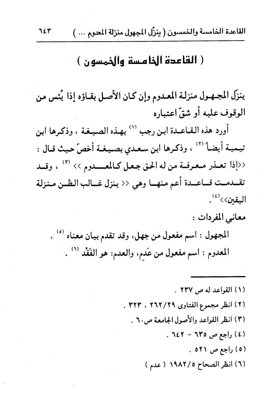 القاعدة الخامسة والخمسون: ينزّل المجهول منزلة المعدوم وإن كان الأصل بقاؤه إذا يُئس من الوقوف عليه أو شق اعتباره.