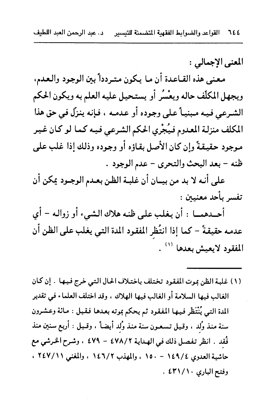 ١ غلبة الظن بموت المفقود تختلف باختلاف الحال التي خرج فيها. وإن كان الغالب فيها السلامة أو الغالب فيها الهلاك، وقد اختلف العلماء في تقدير المدة التي يُنْتَظر فيها المفقود ثم يحكم بموته بعدها فقيل: مائة وعشرون سنة منذ ولد، وقيل تسعون سنة منذ ولد أيضا، وقيل: أربع سنين منذ فقد. انظر تفصيل ذلك في الهداية ٢/٤٧٨-٤٧٩، وشرح الخرشي مع حاشية العدوي ٤/١٤٩-١٥٠، والمهذب ٢/١٤٦، والمغني ١١/٢٤٧، وفتح الباري ١٠/٤٣١.