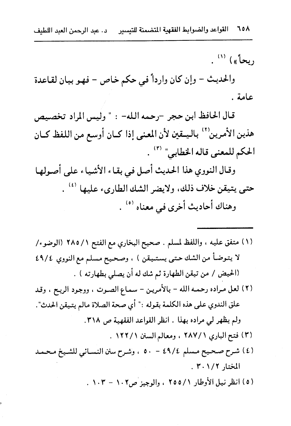 ٢ لعل مراد رحمه الله -بالأمرين - سماع الصوت, ووجود الريح, وقد علق الندوي على هذه الكلمة بقوله: "أي صحة الصلاة مالم يتيقن الحديث".ولم يظهر لي مراده بهذا. انظر القواعد الفقهية ص٣١٨.