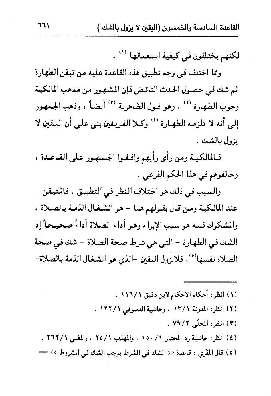 والسبب في ذلك هو اختلاف النظر في تطبيق. فالمتيقن -عند الملكية ومن قال بقولهم هنا- هو انشغال الذمة بالصلاة, والمشكوك فيه هو سبب الإبراء وهو أداء الصلاة أداءً صحيحاً إذ الشك في طهارة -التي هي شرط صحة الصلاة- شك في صحة الصلاة نفسها٥, فلا يزول اليقين -الذي هو انشغال الذمة بالصلاة-