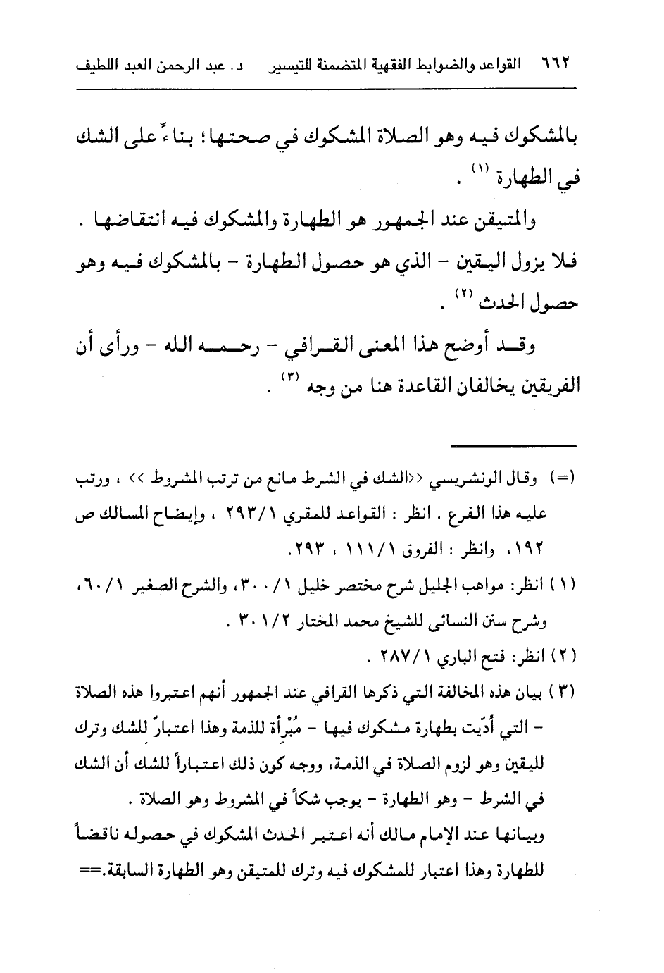 ٣ بيان هذه المخالفة التي ذكرها القرافي عند الجمهور أنهم اعتبروا هذه الصلاة - التي أدت بطهارة مشكوك فيها-مبرأة للذمة وهذا اعتبار للشك وترك لليقين وهو لزوم الصلاة في الذمة, ووجه كون ذلك اعتباراً للشك أن الشك في الشرط - وهو الطهارة- يوجب شكاً في المشروط وهو الصلاة. وبيانها عند الإمام مالك أنه اعتبر الحديث المشكوك في حصوله ناقضاً للطهارة وهذا اعتبار للمشكوك فيه وترك المتيقن وهو الطهارة السابقة فالجمهور خالفوا القاعدة في الصلاة, ومالك خالفها في الحدث. انظر الفروق ١/١١١-١١٢, والقوانين الفقهية ص٢٦, والشرح الصغير ١/٦٠, وشرح الحطاب ١/٣٠٠, وشرح سنن النسائي للشيخ محمد المختار ٢/٣٠١.