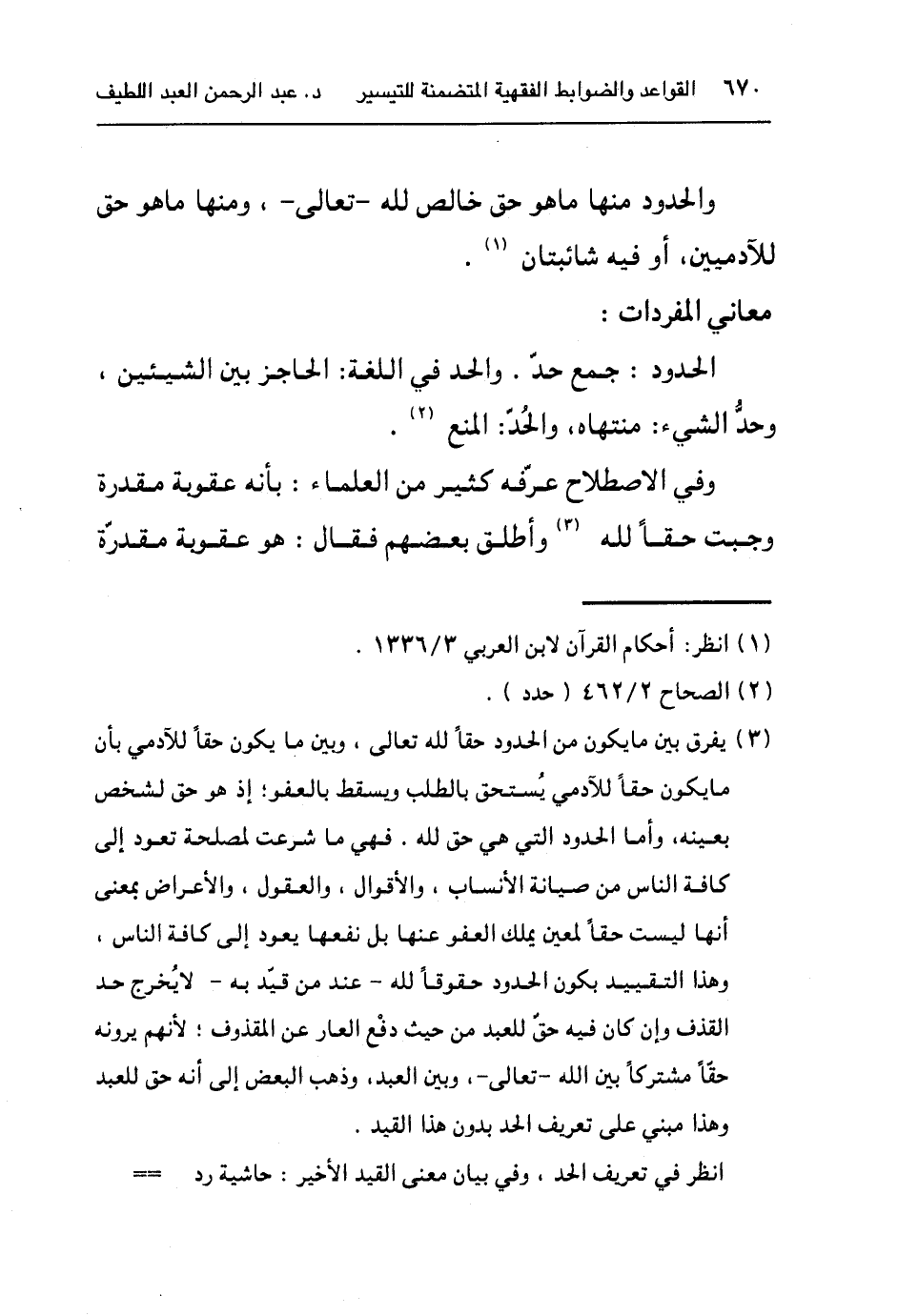 ٣ يفرق بين ما يكون من الحدود حقا لله تعالى ,وبين ما يكون حقاً للآدمي بأن ما يكون حقا ًللآدمي يستحق بالطلب ويسقط بالعفو؛ إذ هو حق لشخص بعينه, وأما الحدود التي هي حق لله.فهي ما شرعت لمصلحة تعود إلى كافة الناس من صيانة الأنساب, والأقوال, والعقول, والاعتراض بمعنى أنها ليست حقاً لمعين يملك العفو عنها بل نفعها يعود إلى كافة الناس وهذا التقييد بكون الحدود حقوقاً لله -عند من قيد به- لا يخرج حد القذف وإن كان فيه حق للعبد من حيث دفع العار عن المقذوف؛لأنهم يرونه حقاً مشتركاً بين الله -تعالى-, وبين العبد وذهب البعض إلى أنه حق للعبد وهذا مبني على تعريف الحد بدون هذا القيد. انظر: في تعريف الحد, وفي بيان معنى القيد الأخير: حاشية رد المختار ٤/٣, ٣١, المغني١٢/٣٨٦, مجموع الفتاوى ٢٨/٢٩٧ وأحكام القرآن لابن العربي ٣/١٣٣٥-١٣٣٦, وأنيس الفقهاء ص١٧٣ ونيل الأوطار ٧/٢٥٠.