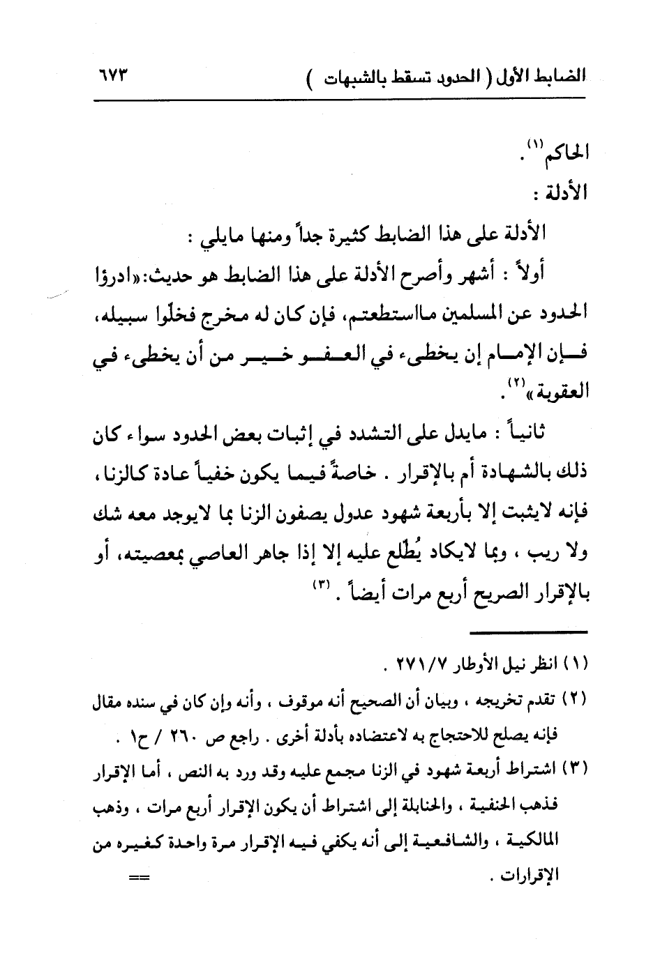 أولا: أشهر وأصرح الأدلة على هذا الضابط هو حديث: "ادرؤا الحدود عن المسلمين ما استطعتم, فإن كان له مخرج فخلوا سبيله, فإن الإمام إن يخطئ في العفو خير من أن يخطئ في العقوبة"٢.