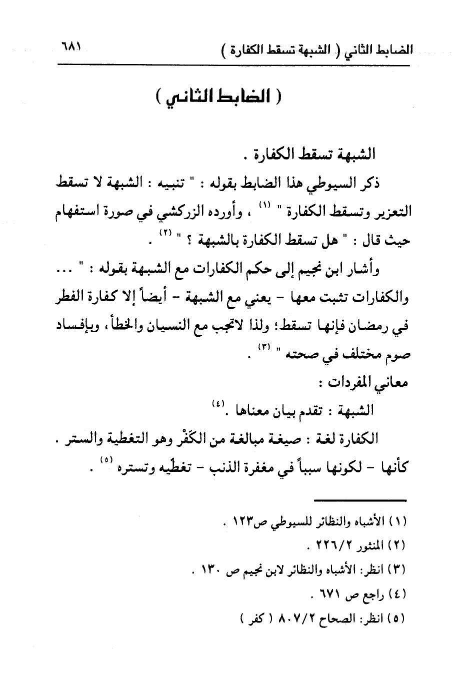 ذكر السيوطي هذا الضابط بقوله: "تنبيه: الشبهة لا تسقط التعزير وتسقط الكفارة"١، وأورده الزركشي في صورة استفهام حيث قال: "هل تسقط الكفارة بالشبهة؟ "٢.