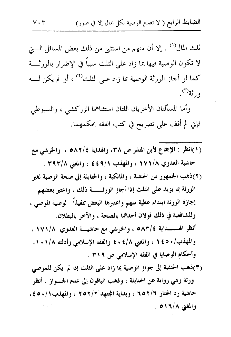٣ ذهب الحنفية إلى جواز الوصية بما زاد على الثلث إذا لم يكن للموصي ورثة وهي رواية عن الحنابلة، وذهب الباقون إلى عدم الجواز. انظر: حاشية رد المحتار ٦/٦٥٢، وبداية المجتهد ٢/٢٥٢، والمهذب ١/٤٥٠، والمغني ٨/٥١٦.