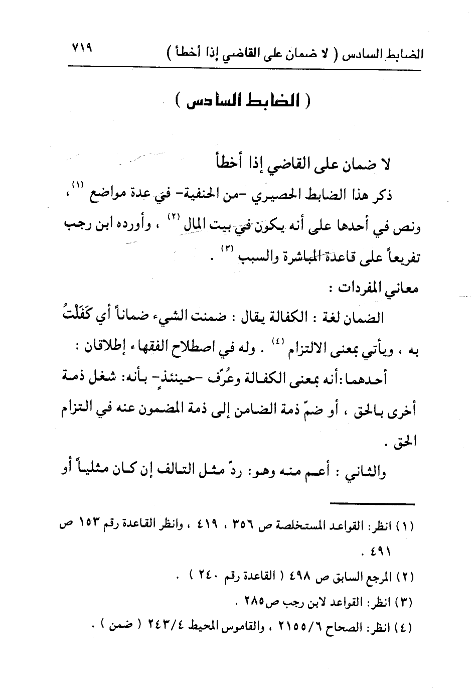 ذكر هذا الضابط الحصيري -من الحنفية - في عدة مواضع١, ونص في أحدها على أنه يكون في بيت المال٢,وأورده ابن رجب تعريفاً على قاعدة المباشرة والسبب٣.