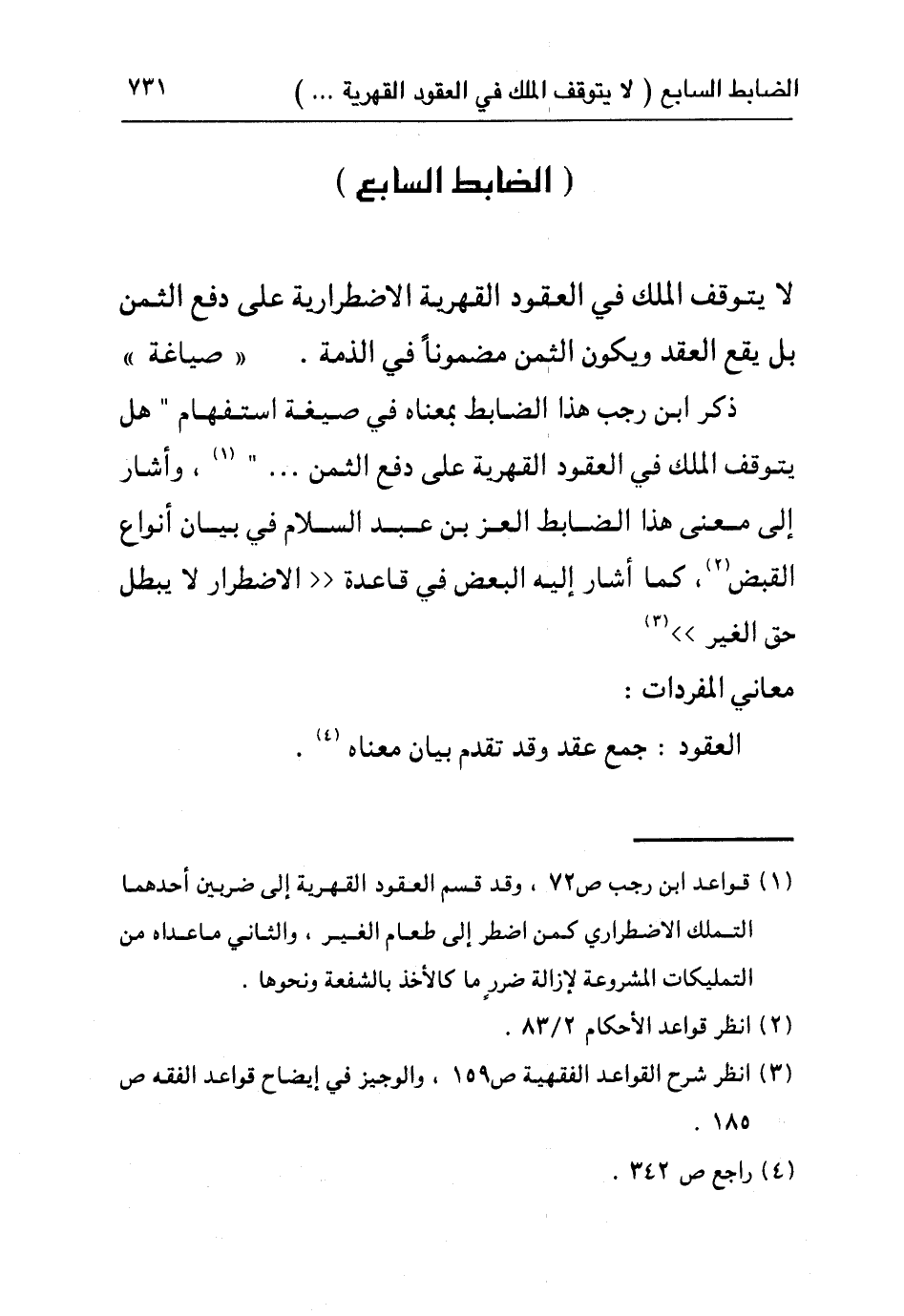 ١ قواعد ابن رجب ص ٧٢,وقد قسم العقود القهرية إلى ضربين أحد هما التملك الاضطراري كمن اضطر إلى طعام الغير, والثاني ماعداه من التمليك المشروعة لإزالة ضرر ما كالأخذ بالشفعة ونحوها.