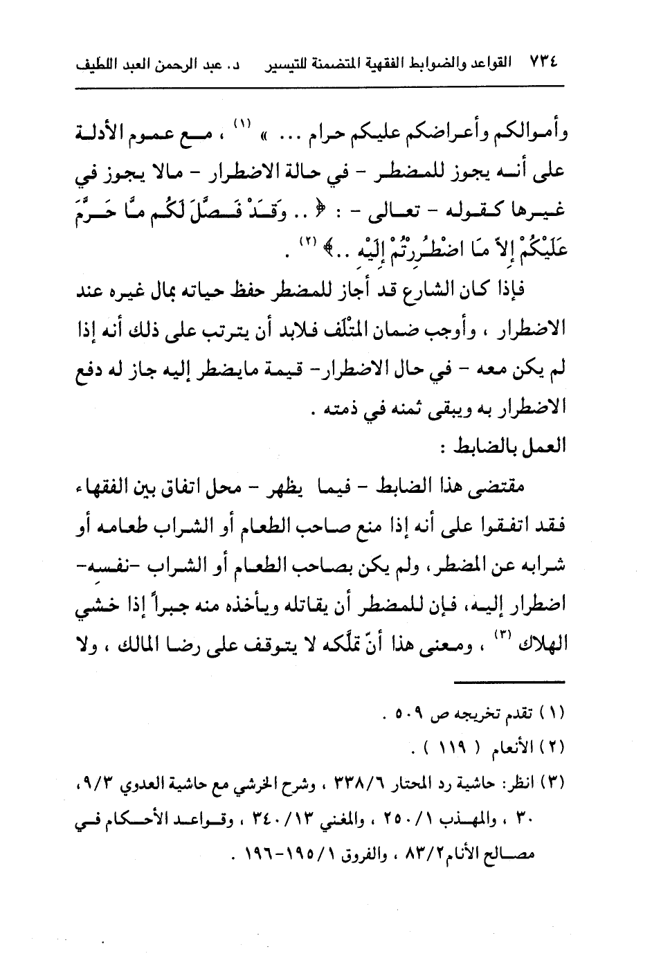 وأموالكم وأعراضكم عليكم حرام ... "١ , مع عموم الأدلة على أنه يجوز للمضطر -في حالة الاضطرار - مالا يجوز في غيرها كقوله -تعالى-: {وَقَدْ فَصَّلَ لَكُمْ مَا حَرَّمَ عَلَيْكُمْ إِلاّ مَا اضْطُرِرْتُمْ إِلَيْه} ٢.