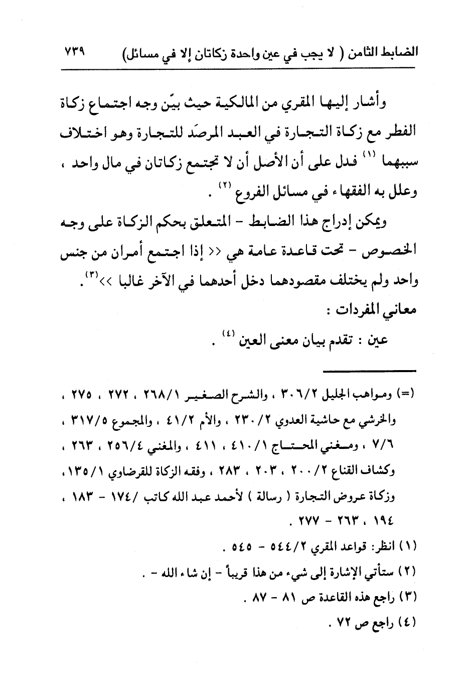 وأشار إليها المقري من المالكية حيث بين وجه اجتماع زكاة الفطر مع زكاة التجارة في العبد المرصد للتجارة وهو اختلاف سببهما١ فدل على أن الأصل أن لا تجتمع زكاتان في مال واحد, وعلل به الفقهاء في مسائل الفروع٢.