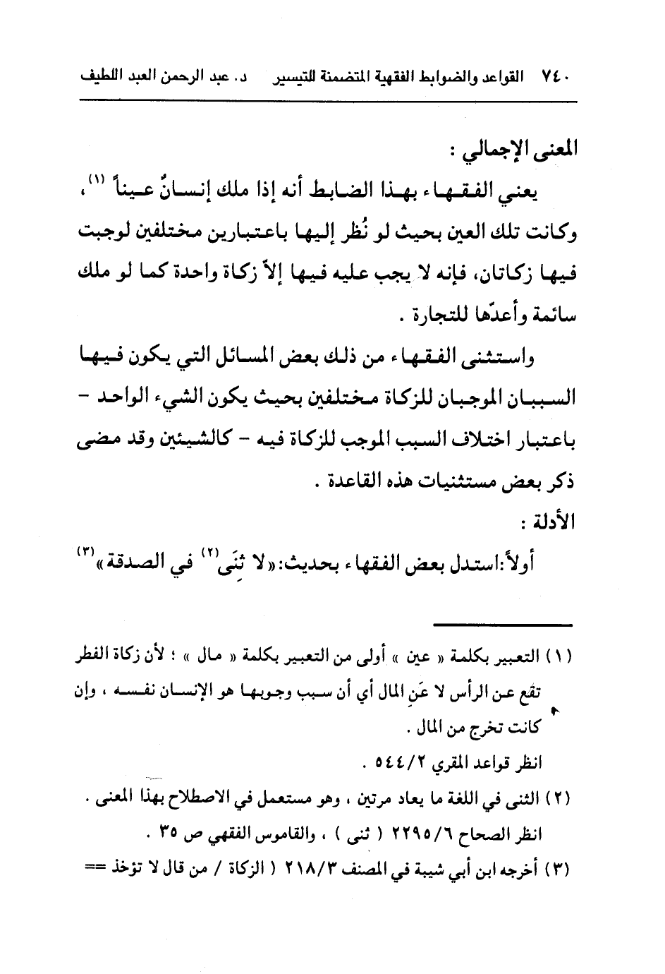 ١ التعبير بكلمة (عين) أولى من تعبير بكلمة (مال) لأن زكاة الفطر تقع عن رأس لا عن المال أي أن سبب وجوبها هو الإنسان نفسه, وإن كانت قواعد المقري ٢/٥٤٤.