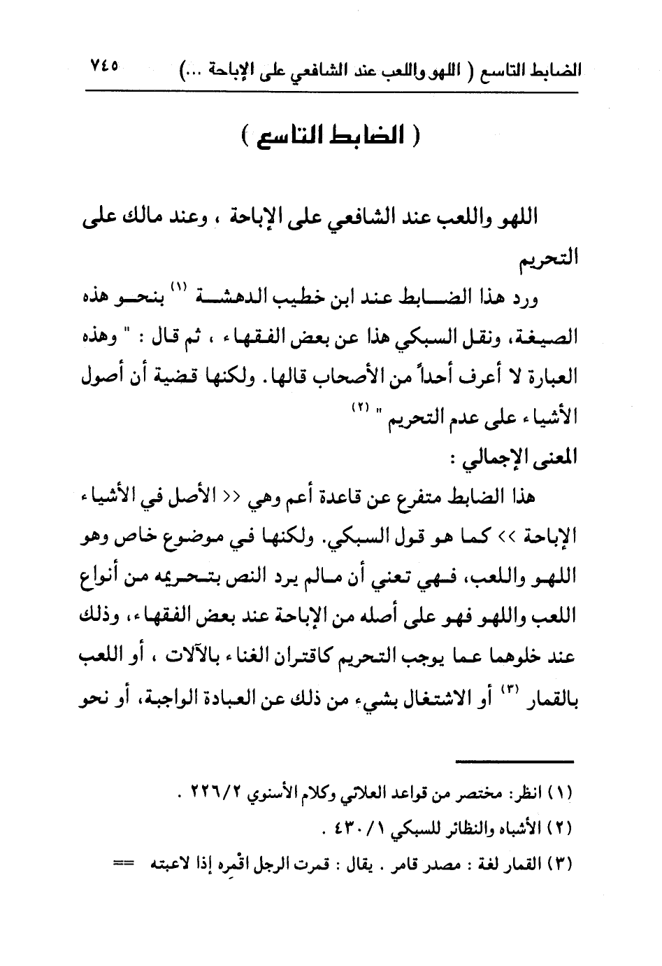 الضابط التاسع: اللهو واللعب عند الشافعية على الإباحة, وعند المالك على التحريم.