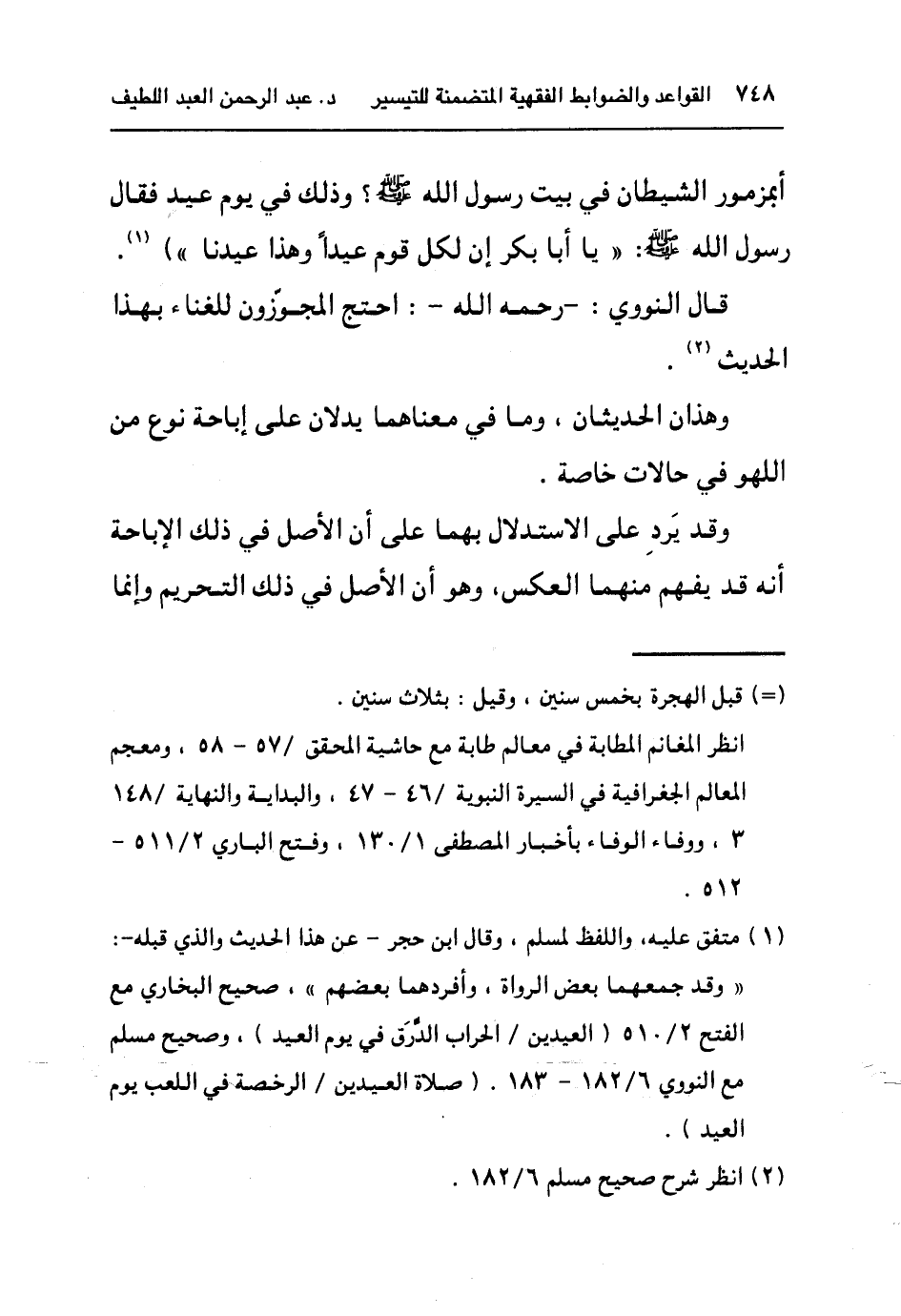 ١ متفق عليه, واللفظ لمسلم, وقال ابن حجر – عن هذا الحديث والذي قبله -: " وقد جمعهما بعض الرواة, وأفرد هما بعضهم", صحيح البخاري مع الفنح٢/٥١٠ (العيدين/الحراب الدرق في يوم العيد) ,وصحيح مسلم مع النووي ٢/١٨٢-١٨٣. (صلاة العيدين /الرخصة في اللعب يوم العيد) .
