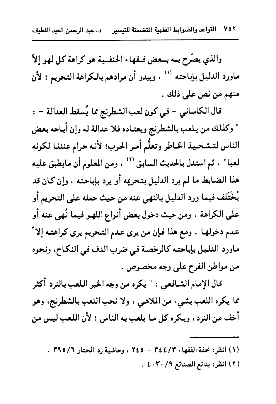 قال الكاساني - في كون لعب الشطرنج مما يسقط العدالة -:" وكذلك من لعب بالشطرنج ويعتاده فلا عدالة له وإن أباحه بعض الناس لتشحيذ الخاطر وتعلم أمر الحرب؛ لأنه حرام عندنا لكونه لعباً",ثم استدل بالحديث السابق٢,ومن المعلوم أن ما يطبق عليه هذا الضابط ما لم يرد الدليل بتحريمه أو يرد بإباحته, وإن كان قد يختلف فيما ورد الدليل بالنهي عنه من حيث حمله على التحريم أو على الكراهة, ومن حيث دخول بعض أنواع اللهو فيما نهي عنه أو عدم دخولها. ومع هذا فإن من يرى عدم التحريم يرى كراهته إلا ما ورد الدليل بإباحته كالرخصة في ضرب الدف النكاح, ونحوه من مواطن الفرح على وجه مخصوص.