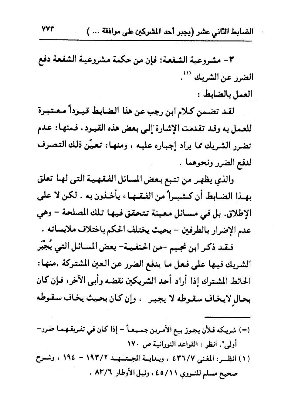 لقد تضمن كلام ابن رجب عن هذا الضابط قيوداً معتبرة للعمل به وقد تقدمت الإشارة إلى بعض هذه القيود, فمنها: عدم تضرر الشريك مما يراد إجباره عليه, ومنها: تعين ذلك التصرف لدفع الضرر ونحوهما.