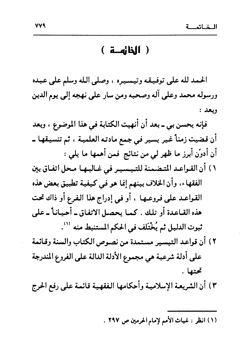 ١) أن القواعد المتضمنة التيسير في غالبها محل اتفاق بين الفقهاء, وأن الخلاف بينهم إنما هو في كيفية تطبيق بعض هذه القواعد أتلك. كما يحصل الاتفاق – أحيانا – على ثبوت الدليل ثم يختلف في الحكم المسنتبط منه.١