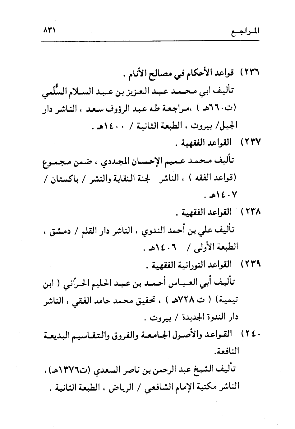تأليف أبي محمد عبد العزيز بن عبد السلام السلمي (ت ٦٦٠هـ) ، ومراجعة طه عبد الارؤوف سعد، الناشر دار الجيل/بيروت، الطبعة الثانية ١٤٠٠هـ.