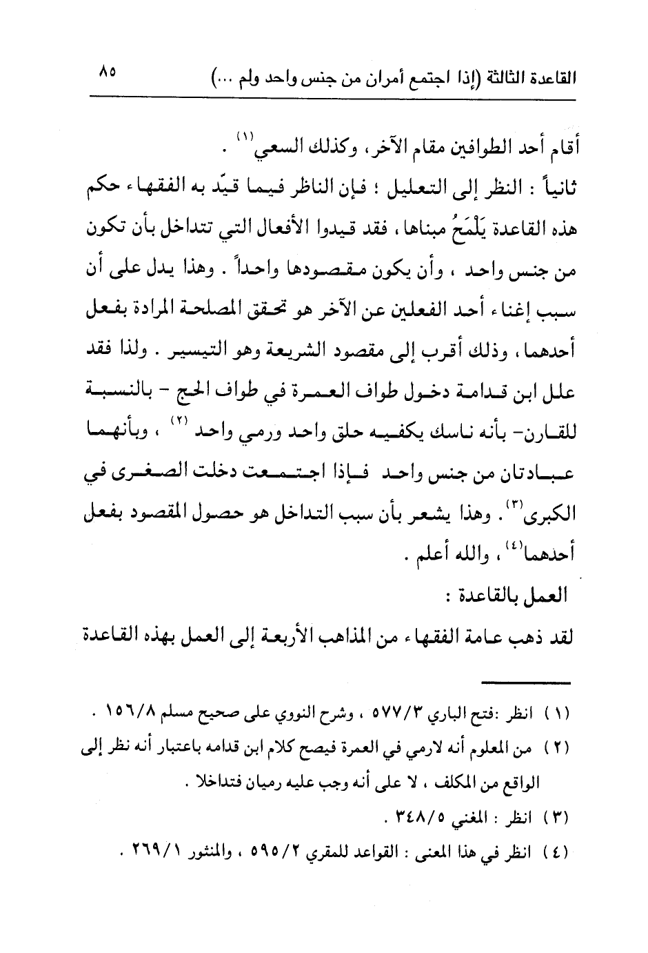 ثانيا: النظر إلى التعليل؛ فإن الناظر فيما قيّد به الفقهاء حكم هذه القاعدة يَلْمَحُ مبناها، فقد قيدوا الأفعال التي تتداخل بأن تكون من جنس واحد، وأن يكون مقصودها واحدًا. وهذا يدل على أن سبب إغناء أحد الفعلين عن الآخر هو تحقق المصلحة المرادة بفعل أحدهما، وذلك أقرب إلى مقصود الشريعة وهو التيسير. ولذا فقد علل ابن قدامة دخول طواف العمرة في طواف الحج - بالنسبة للقارن - بأنه ناسك يكفيه حلق واحد ورمي واحد٢، وبأنهما عبادتان من جنس واحد فإذا اجتمعت دخلت الصغرى في الكبرى٣. وهذا يشعر بأن سبب التداخل هو حصول المقصود بفعل أحدهما٤، والله أعلم.