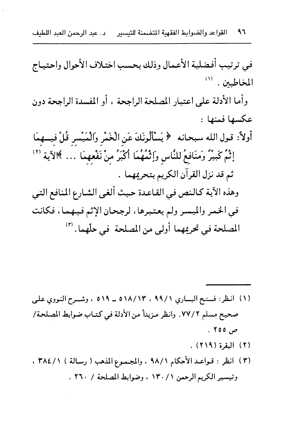 ٣ انظر: قواعد الأحكام ١/٩٨، والمجموع المذهب (رسالة) ١/٣٨٤، وتيسير الكريم الرحمن ١/١٣٠، وضوابط المصلحة /٢٦٠.