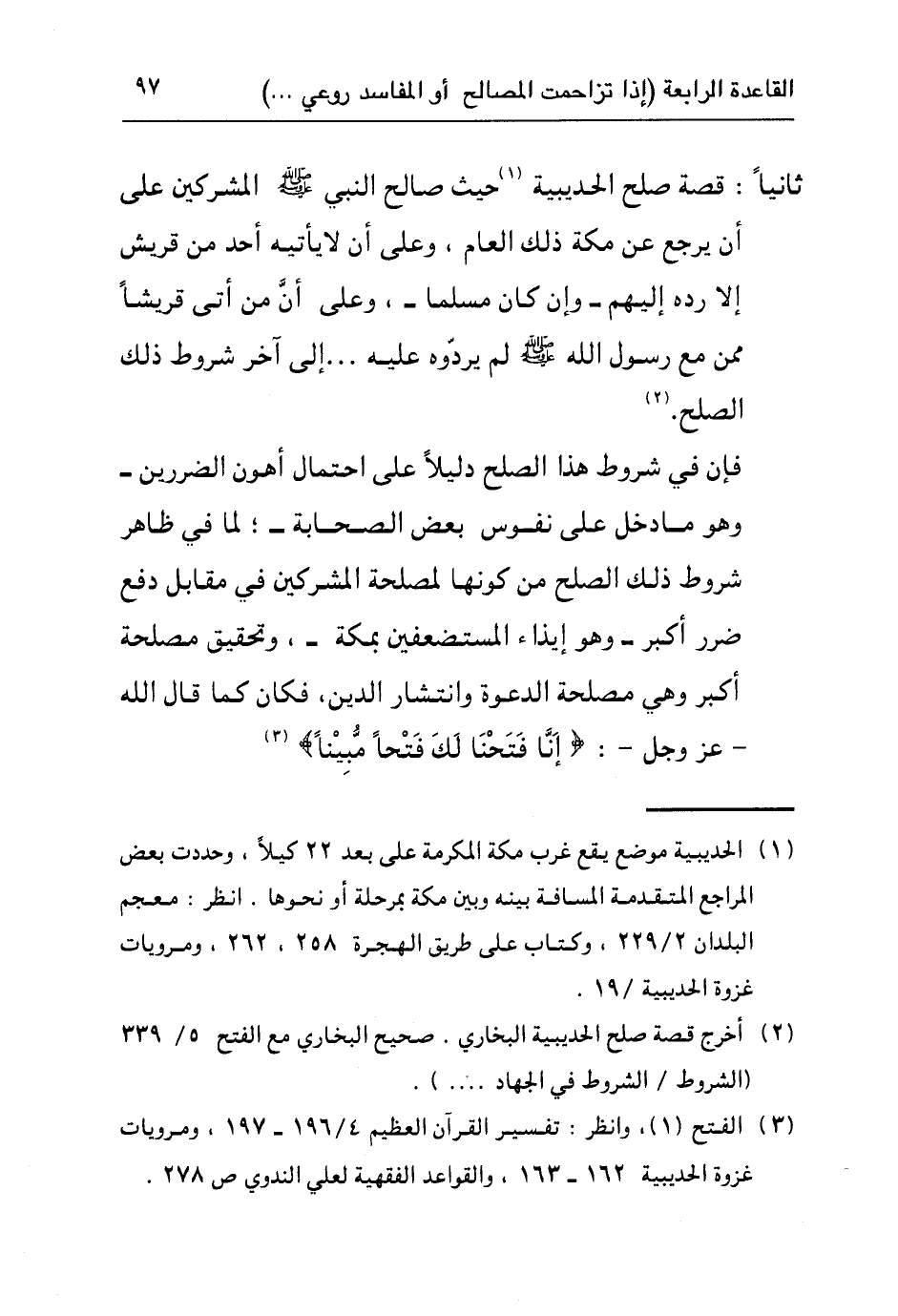 ٣ الفتح (١) ، وانظر: تفسير القرآن العظيم ٤/١٩٦-١٩٧، ومرويات غزوة الحديبية ١٦٢-١٦٣، والقواعد الفقهية لعلي الندوي ص٢٧٨.