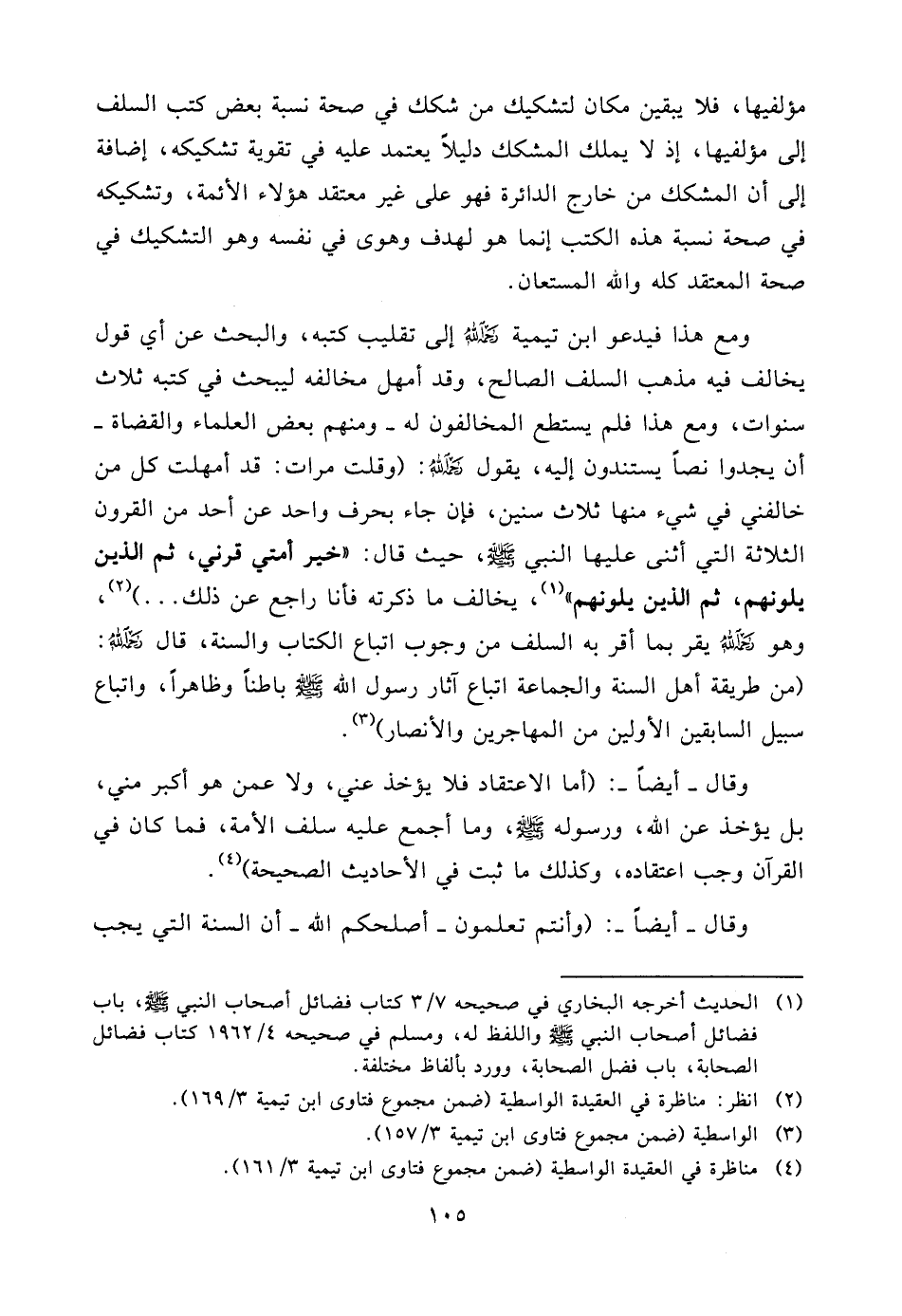ومع هذا فيدعو ابن تيمية رحمه الله إلى تقليب كتبه، والبحث عن أي قول يخالف فيه مذهب السلف الصالح، وقد أمهل مخالفه ليبحث في كتبه ثلاث سنوات، ومع هذا فلم يستطع المخالفون له - ومنهم بعض العلماء والقضاة - أن يجدوا نصاً يستندون إليه، يقول رحمه الله: (وقلت مرات: قد أمهلت كل من خالفني في شيء منها ثلاث سنين، فإن جاء بحرف واحد عن أحد من القرون الثلاثة التي أثنى عليها النبي صلّى الله عليه وسلّم، حيث قال: «خير أمتي قرني، ثم الذين يلونهم، ثم الذين يلونهم» (¬1) ، يخالف ما ذكرته فأنا راجع عن ذلك ... ) (¬2) ، وهو رحمه الله يقر بما أقر به السلف من وجوب اتباع الكتاب والسنة، قال رحمه الله: (من طريقة أهل السنة والجماعة اتباع آثار رسول الله صلّى الله عليه وسلّم باطناً وظاهراً، واتباع سبيل السابقين الأولين من المهاجرين والأنصار) (¬3) .