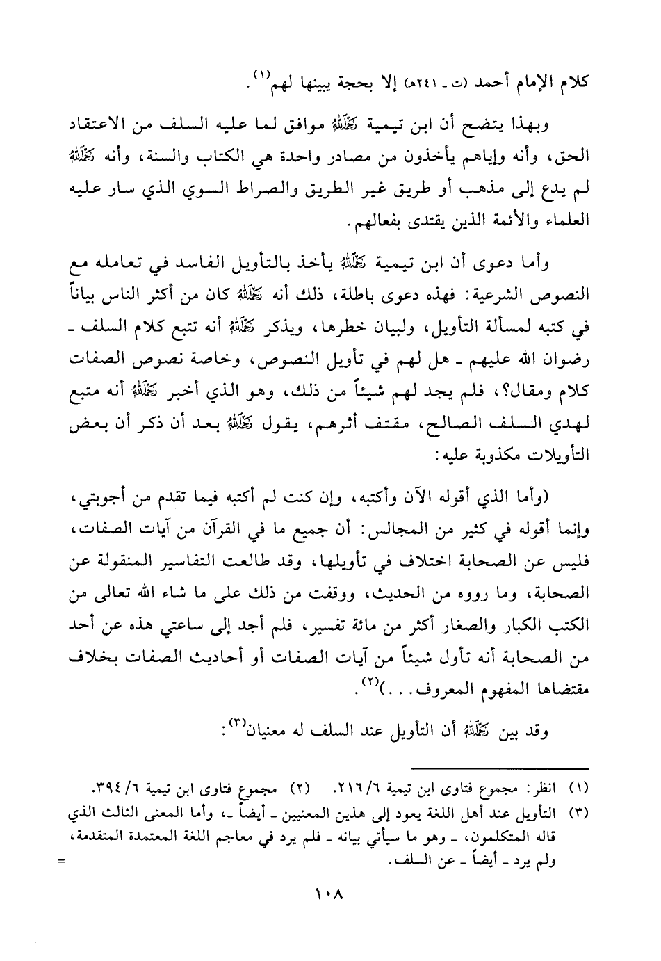 وأما دعوى أن ابن تيمية رحمه الله يأخذ بالتأويل الفاسد في تعامله مع النصوص الشرعية: فهذه دعوى باطلة، ذلك أنه رحمه الله كان من أكثر الناس بياناً في كتبه لمسألة التأويل، ولبيان خطرها، ويذكر رحمه الله أنه تتبع كلام السلف - رضوان الله عليهم - هل لهم في تأويل النصوص، وخاصة نصوص الصفات كلام ومقال؟، فلم يجد لهم شيئاً من ذلك، وهو الذي أخبر رحمه الله أنه متبع لهدي السلف الصالح، مقتف أثرهم، يقول رحمه الله بعد أن ذكر أن بعض التأويلات مكذوبة عليه: