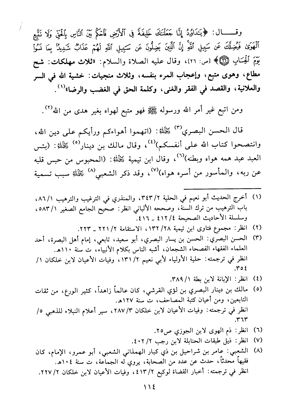 وقال: {يَا دَاوُدُ إِنَّا جَعَلْنَاكَ خَلِيفَةً فِي الْأَرْضِ فَاحْكُمْ بَيْنَ النَّاسِ بِالْحَقِّ وَلا تَتَّبِعِ الْهَوَى فَيُضِلَّكَ عَنْ سَبِيلِ اللَّهِ إِنَّ الَّذِينَ يَضِلُّونَ عَنْ سَبِيلِ اللَّهِ لَهُمْ عَذَابٌ شَدِيدٌ بِمَا نَسُوا يَوْمَ الْحِسَابِ} [ص: 26] ، وقال عليه الصلاة والسلام: «ثلاث مهلكات: شح مطاع، وهوى متبع، وإعجاب المرء بنفسه، وثلاث منجيات: خشية الله في السر والعلانية، والقصد في الفقر والغنى، وكلمة الحق في الغضب والرضا» (¬1) .