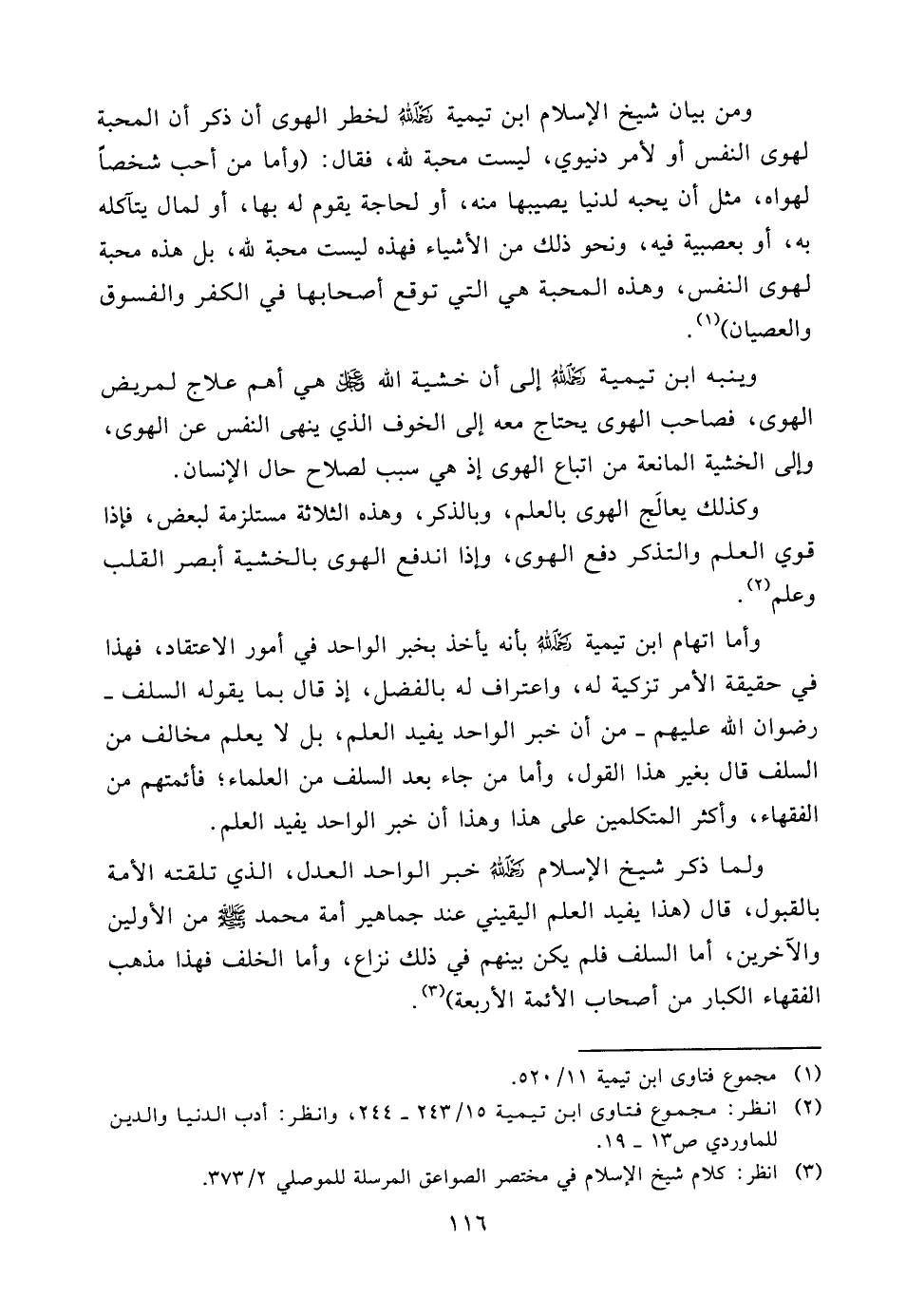 ولما ذكر شيخ الإسلام رحمه الله خبر الواحد العدل، الذي تلقته الأمة بالقبول، قال (هذا يفيد العلم اليقيني عند جماهير أمة محمد صلّى الله عليه وسلّم من الأولين والآخرين، أما السلف فلم يكن بينهم في ذلك نزاع، وأما الخلف فهذا مذهب الفقهاء الكبار من أصحاب الأئمة الأربعة) (¬3) .