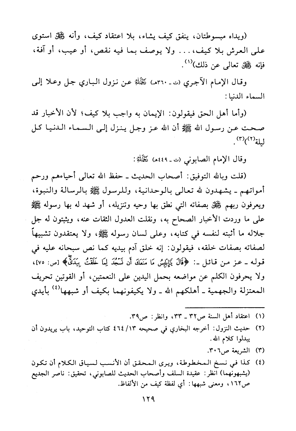 (ويداه مبسوطتان، ينفق كيف يشاء، بلا اعتقاد كيف، وأنه عزّ وجل استوى على العرش بلا كيف، ... ولا يوصف بما فيه نقص، أو عيب، أو آفة، فإنه عزّ وجل تعالى عن ذلك) (¬1) .