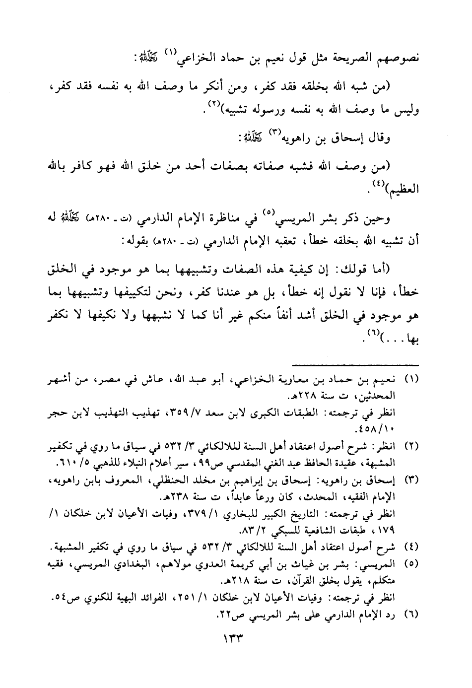 (¬2) انظر: شرح أصول اعتقاد أهل السنة لللالكائي 3/532 في سياق ما روي في تكفير المشبهة، عقيدة الحافظ عبد الغني المقدسي ص99، سير أعلام النبلاء للذهبي 5/610.