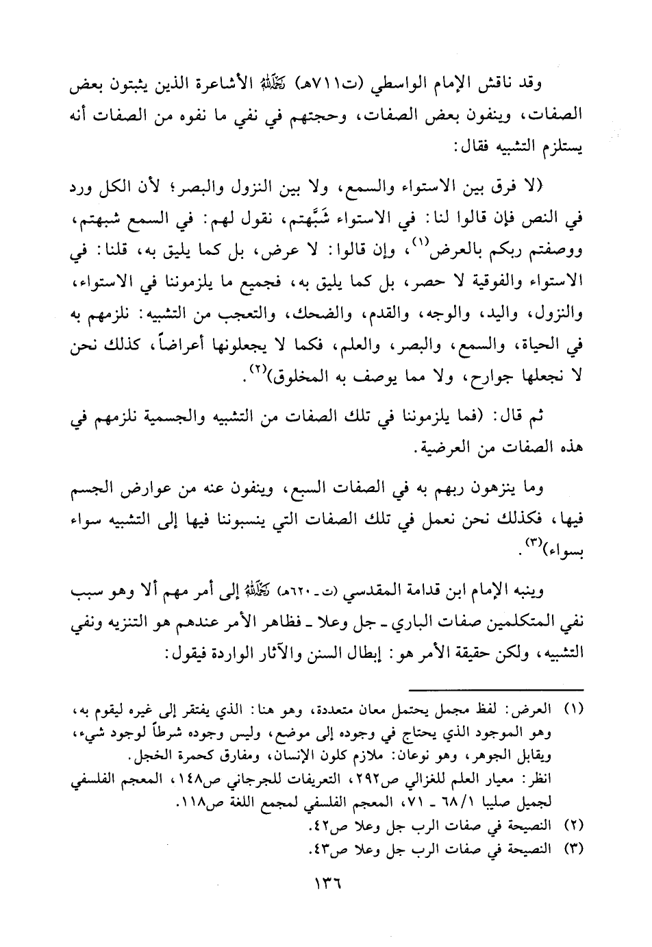 وقد ناقش الإمام الواسطي (ت711هـ) رحمه الله الأشاعرة الذين يثبتون بعض الصفات، وينفون بعض الصفات، وحجتهم في نفي ما نفوه من الصفات أنه يستلزم التشبيه فقال: