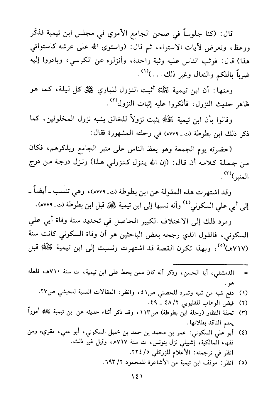 (¬3) تحفة النظار (رحلة ابن بطوطة) ص113، وقد ذكر أثناء حديثه عن ابن تيمية رحمه الله أموراً يعلم الناقد بطلانها.