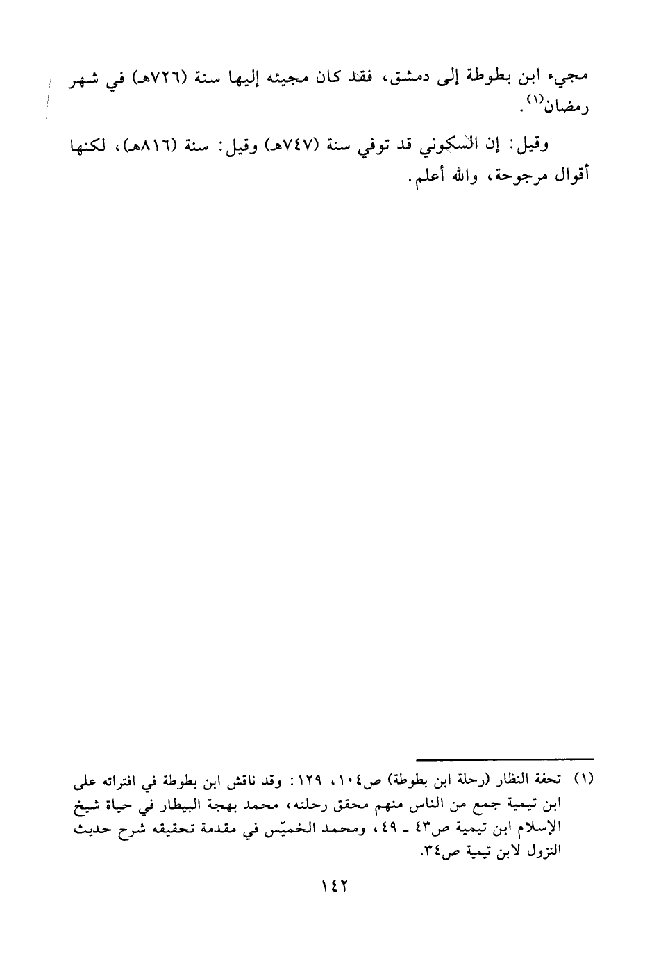 (¬1) تحفة النظار (رحلة ابن بطوطة) ص104، 129: وقد ناقش ابن بطوطة في افترائه على ابن تيمية جمع من الناس منهم محقق رحلته، محمد بهجة البيطار في حياة شيخ الإسلام ابن تيمية ص43 - 49، ومحمد الخميّس في مقدمة تحقيقه شرح حديث النزول لابن تيمية ص34.