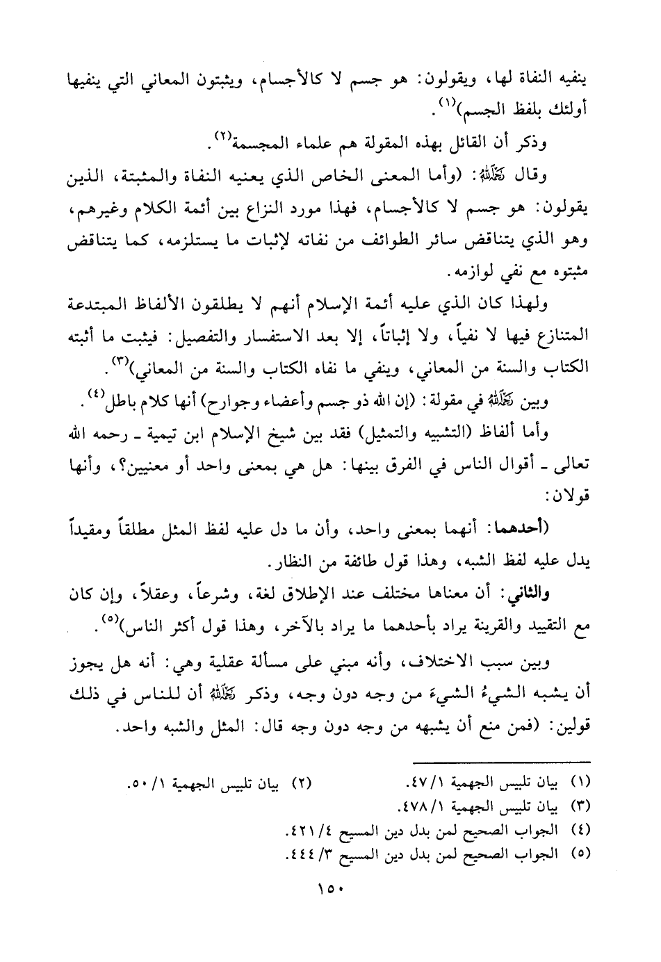 وقال رحمه الله: (وأما المعنى الخاص الذي يعنيه النفاة والمثبتة، الذين يقولون: هو جسم لا كالأجسام، فهذا مورد النزاع بين أئمة الكلام وغيرهم، وهو الذي يتناقض سائر الطوائف من نفاته لإثبات ما يستلزمه، كما يتناقض مثبتوه مع نفي لوازمه.