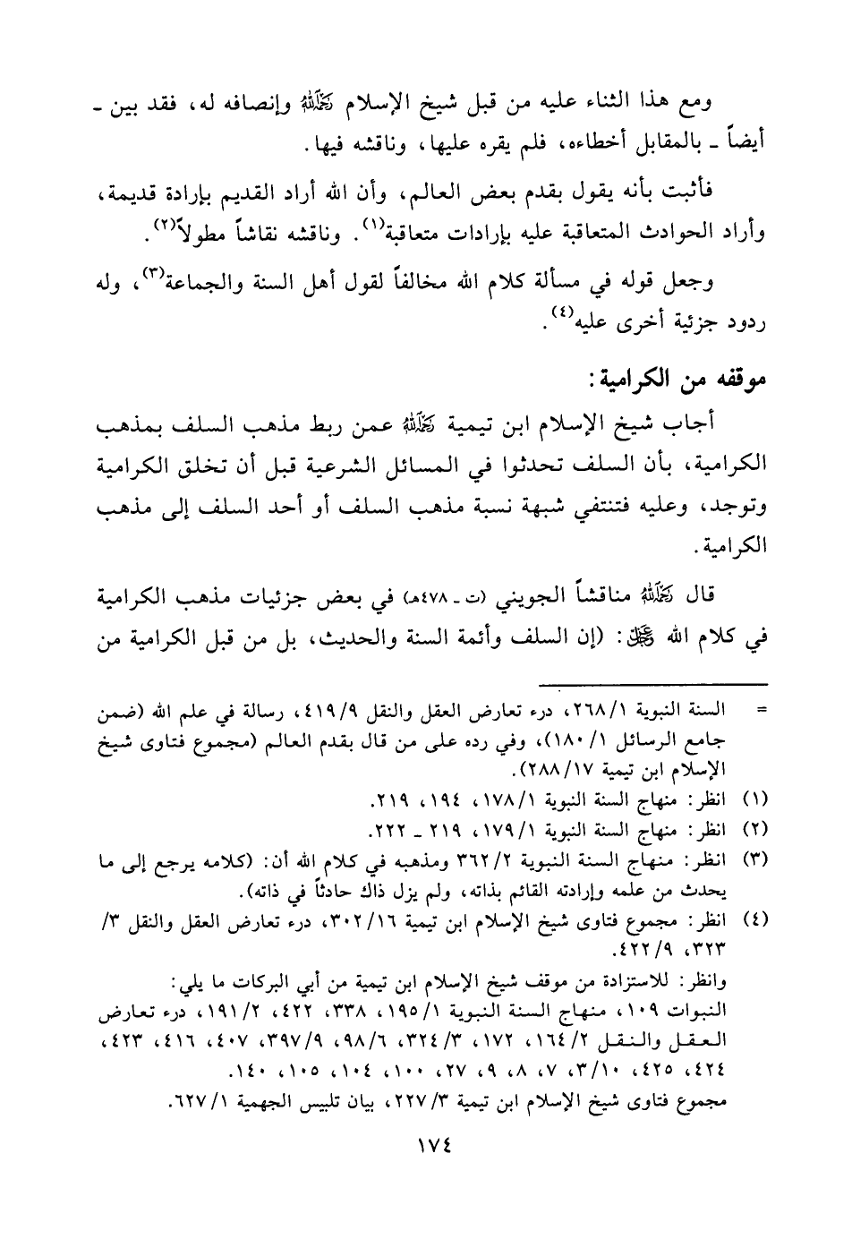 قال رحمه الله مناقشاً الجويني (ت - 478هـ) في بعض جزئيات مذهب الكرامية في كلام الله عزّ وجل: (إن السلف وأئمة السنة والحديث، بل من قبل الكرامية من